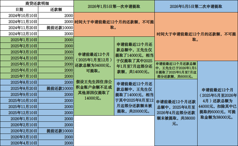 (3)假设2026年1月5日第一次申请提取时,王先生因住房公积金账户余额不足仅提取14000元,相当于仅提取了该笔商贷2025年1月至7月这部分还款额。2026年5月5日,王先生第二次以偿还该笔商贷本息申请提取住房公积金,此次申请前最近12个月(2025年5月至2026年4月)使用自有资金还款总额为44000元,王先生已于2026年1月5日提取了其中2025年5月至7月这部分还款额共6000元,所以此次提取的可提取金额为44000元-6000元=38000元。