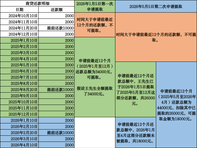 (2)假设2026年1月5日第一次申请提取时,王先生全额提取了34000元的可提取金额,相当于全额提取了该笔商贷2025年1月至12月使用自有资金还款总额。2026年5月5日,王先生第二次以偿还该笔商贷本息申请提取住房公积金,此次申请前最近12个月(2025年5月至2026年4月)使用自有资金还款总额为2000×12+10000+10000=44000元,王先生已于2026年1月5日提取了其中2025年5月至12月这部分还款额为2000×8+10000=26000元,所以此次提取的可提取金额为44000元-26000元=18000元。