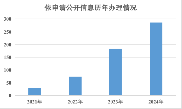 2024年共收到政府信息依申请公开286件(含上年结转13件),增长超去年全年总量(184件)的55%,其中信函渠道申请136件,网络线上申请148件(含19件结转至2025年办理),群众当面申请2件。受理件均在规定时间内按照规定流程答复完毕。申请内容集中在前期物业服务、房地产开发、工程建设项目手续材料等领域。