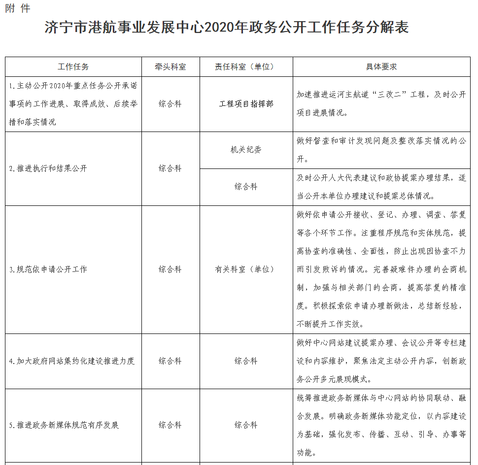 3. 为贯彻落实市政府办公室《关于印发2020年禁漫天堂政务公开工作任务分解表的通知》要求,中心对照《2020年禁漫天堂政务公开工作任务分解表》,结合自身工作实际,制定并公开了《落实2020年全市政务公开工作任务实施方案》,梳理出9项政务公开工作任务,明确责任分工,强化日常监督,确保各项公开任务落实到位。