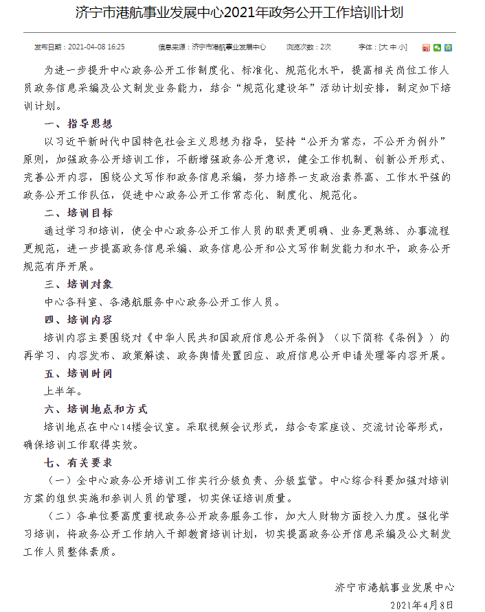2.中心于2021年4月份发布了政务公开业务培训计划,并按计划于5月份开展了提升政务公开工作能力专题培训班。