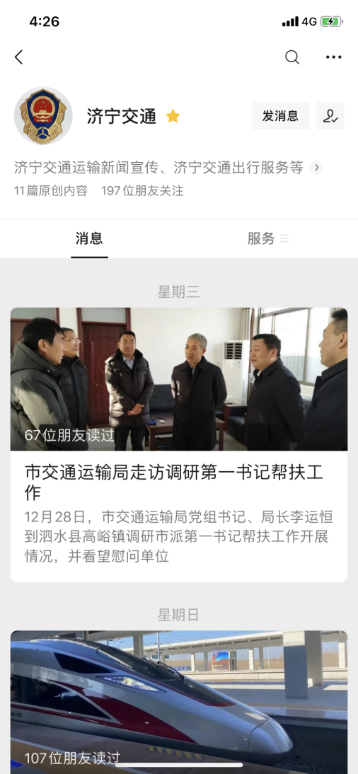 市交通运输局政府信息公开以门户网站为主导载体,单独设置“政府信息公开”专栏,下设“政策文件”“通知公告”等十余个子栏目,最大限度方便群众查询。大力发展政务新媒体,通过“济宁交通”政务持续发布交通运输信息,回应公众关切。“济宁交通”微信公众号粉丝超过16600人,大幅提升交通运输系统政策信息的公众知晓率。