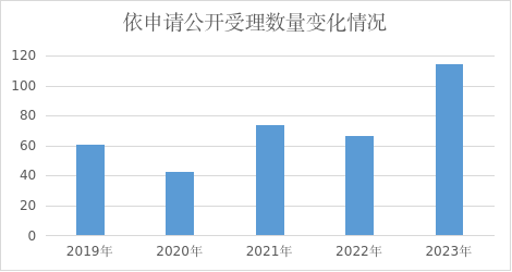 进一步明确依申请公开办理流程,将流程细化为申请接受、登记、补正、拟办、征求第三方意见、审核、做出答复、送达、存档等9个环节;建立市政府依申请公开办理台账,明确各环节办理时限,严格按照时限进行办理,确保规范、及时答复。2023年,市政府办公室累计受理依申请公开件115件,同比增长71.64%,受理省政府协查函74件,同比增长196%,均在法定期限内予以答复,未因依申请公开引发行政复议和行政诉讼,有效提升依申请公开办理的法治化水平。