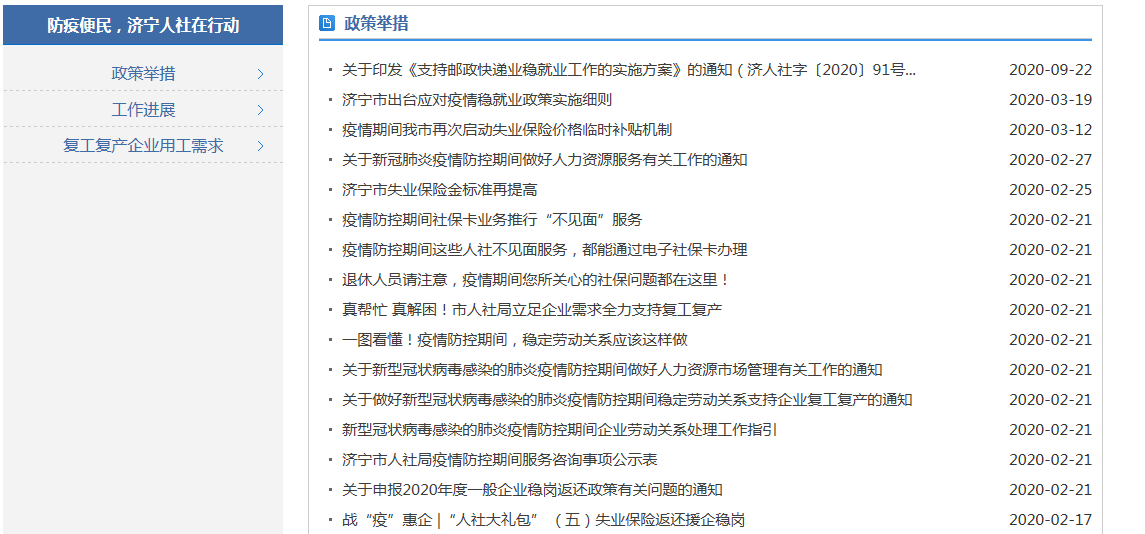 (五)平台建设。根据政务公开要求,完善了信息公开目录,提升了网站信息检索功能和无障碍浏览等功能。充分运用“济宁人社”微信公众号、“济宁人社通”App等新媒体平台发布、解读政策,促进了政民互动。面对疫情,第一时间在门户网站开设了“防疫便民,济宁人社在行动”专栏,推出“战疫惠企人社大礼包”。