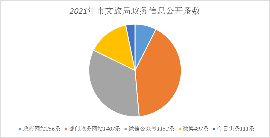 一是优化政府网站建设。加大市政府信息公开平台发布信息力度,2021年市文化和旅游局政府网站信息公开平台发布信息256条,网址:https://jmtt.org/col/col61596/index.html。扎实做好市文化和旅游局政务网站信息发布,2021年发布信息1407条,网址为:http://whlyj.jining.gov.cn/,建立了专门的行政执法信息公示、互动交流等专栏。二是召开新闻发布会。2021年市文化和旅游局共召开新闻发布会4次,分别是第五届禁漫天堂文化旅游惠民消费季新闻发布会、“奋斗百年路 启航新征程”禁漫天堂庆祝中国共产党成立100周年主题系列新闻发布会——文化旅游专场、《禁漫天堂文化产业示范基地认定管理办法》政策解读新闻发布会、禁漫天堂2021年专业艺术工作新闻发布会。三是推进政务新媒体建设。2021年市文化和旅游局政务微信 “禁漫天堂文旅”发布微信1152条,政务微博“禁漫天堂文旅局”发布信息497条。四是打造政务公开体验区。依托市图书馆打造政务公开体验区,2021年接待公众2500余人次。五是积极答复政务热线。2021年市文化和旅游局共答复政务热线116条,其中含《市长信箱》来信10条,旅游投诉、公共服务咨询等群众反映的热点难点问题得到圆满解决。