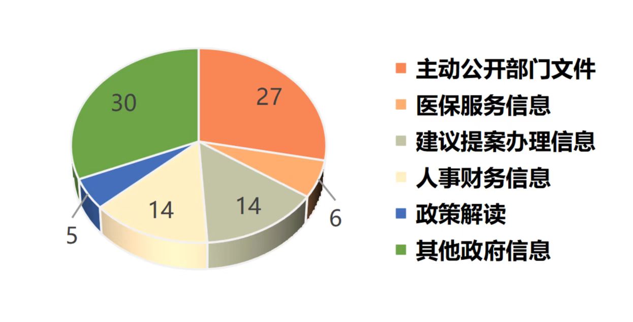 2022年,主动公开政府信息96条,其中主动公开部门文件27条,医保服务信息6条,建议提案办理信息14条,人事财务信息14条,政策解读5条,其他政府信息30条。