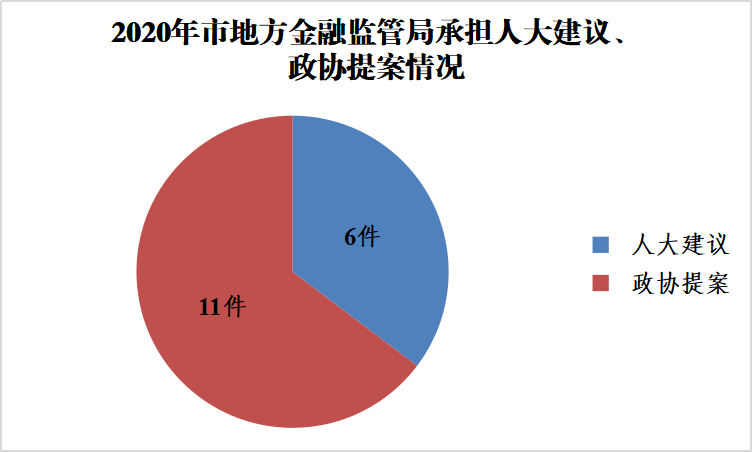 2020年,市地方金融监管局共办理市级人大代表建议、政协提案17件,已全部办复并按时公开,建议提案办结率及代表委员满意率均为100%。