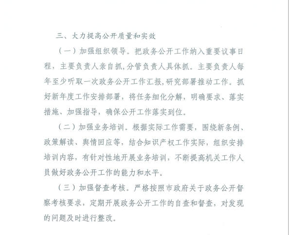 二是拓展政务信息公开渠道,通过微信公众号、市知识产权信息服务平台等渠道和“政府开放日”等活动发布政务信息,加大公开力度。
