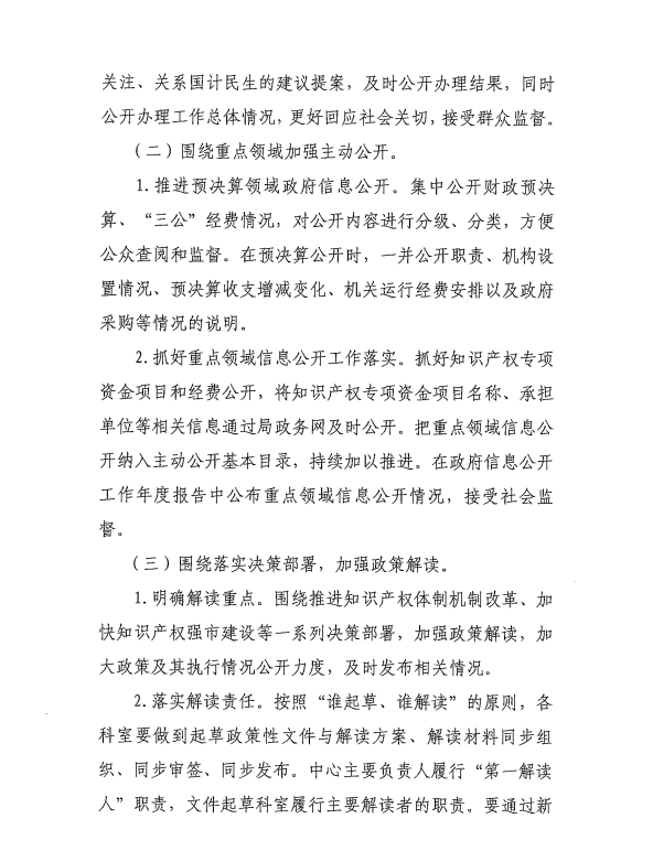 (二)2022年中心根据上级政务公开要求,制定了《市知识产权事业发展中心2022年度政务公开工作安排》,大力加强政务公开解读回应工作,大力推进政务公开制度化、规范化,大力提高公开质量和实效;